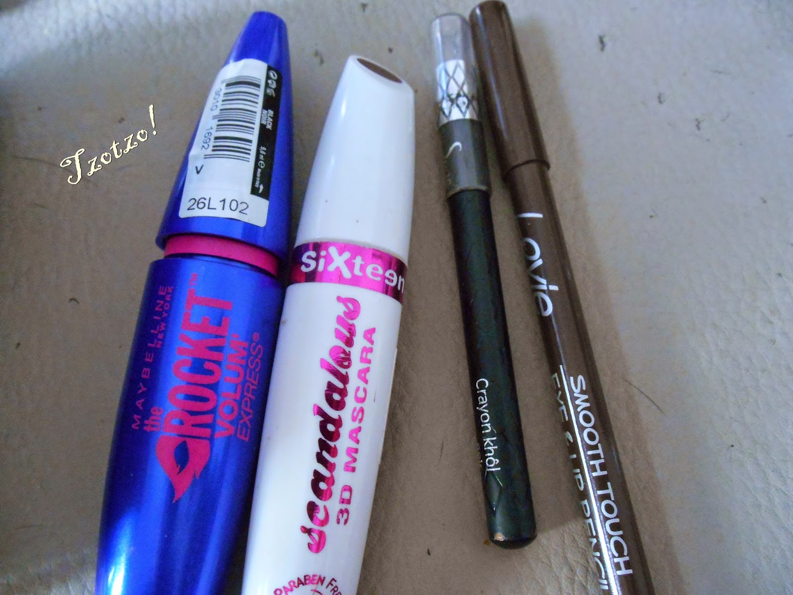 ένα μολύβι ματιών σε καφέ ή μαύρο.Προτείνω το καφέ για να έχετε ένα πιο φυσικό μακιγιάζ,αν ακόμα σας δυσκολεύει το μαύρο.(μάσκαρα: The rocket της Maybelline,Scandalous της Sixteen και μολύβια: το μαύρο της Peggy Saze και το καφέ απο τη Lovie).