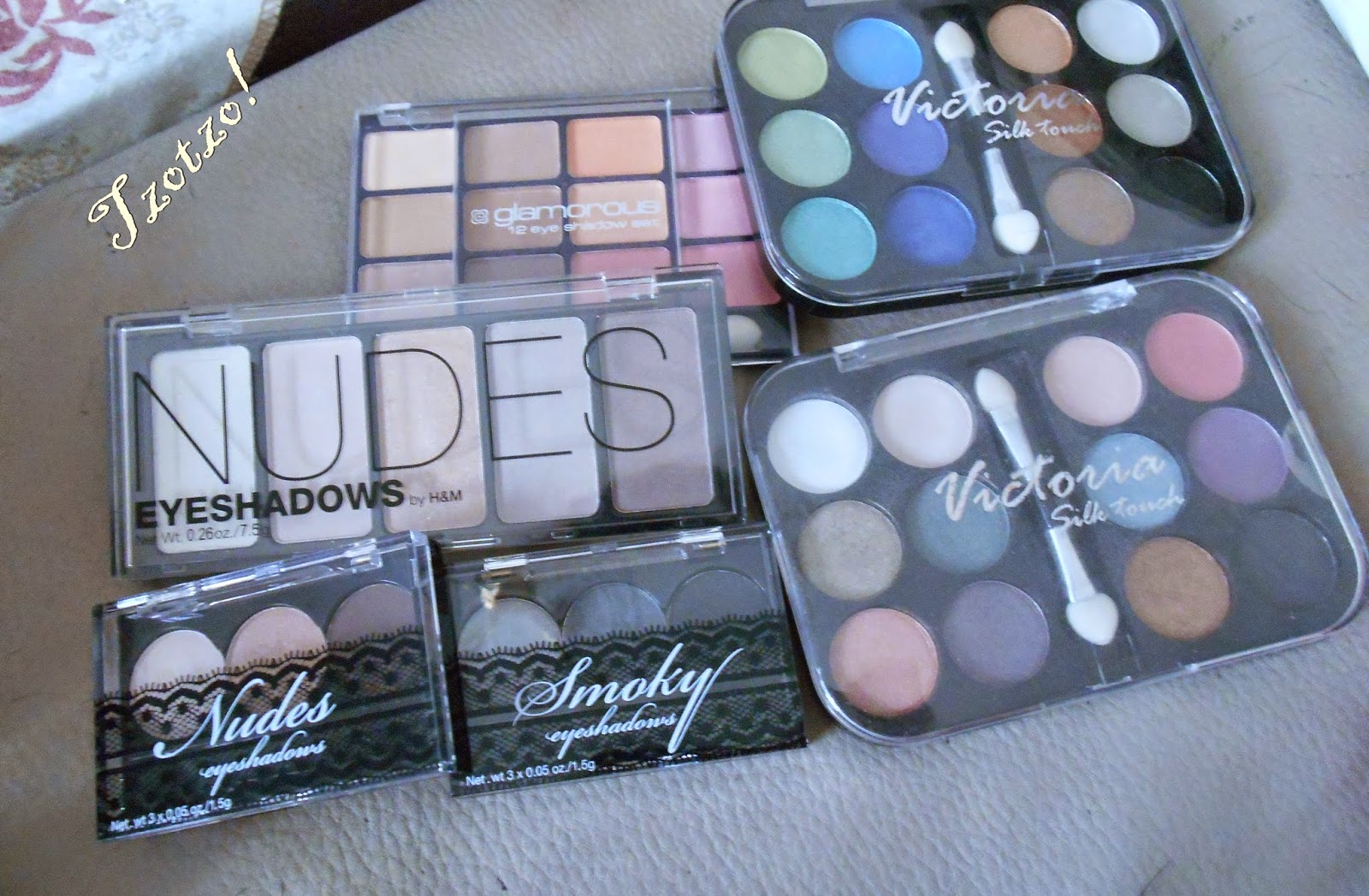 Για τα μάτια σας προτείνω μια παλέτα σκιών. Καλύτερα με γήινα χρώματα,που ταιριάζει σε όλες και είναι εύκολη στη χρήση της και τους συνδυασμούς της.Μην επιλέξετε μονές σκιές,γιατί θα χρειαστείτε αρκετά χρώματα και δεν είναι εύκολα στη μεταφορά τους.(Glamorous,Nudes απο τα H&M,Nudes και Smoky απο τα H&M και δυο παλέτες απο τα Jumbo).