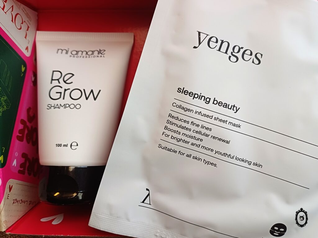 Τέλος, το πέμπτο προϊόν είναι η Sleeping Beauty, Collagen Infused Sheet Mask, της εταιρίας Yenges. Απο την εταιρία αυτή έχω δοκιμάσει και άλλα προϊόντα, τα οποία μου αρέσουν, οπότε θέλω πολύ να δοκιμάσω και αυτή τη μάσκα. Αποτελείται απο κολλαγόνο, αλλαντοΐνη και εκχύλισμα κόκκινων φυκιών, τα οποία βοηθούν στην αναζωογόνηση της επιδερμίδας, μειώνουν τις λεπτές γραμμές και ρυτίδες και την ενυδατώνουν. Την χρησιμοποιούμε για πολλές ώρες μέχρι να γίνει διάφανη ή όλο το βράδυ και μετά συνεχίζουμε με την ρουτίνα περιποίησης που έχουμε. Αποφεύγουμε την περιοχή των ματιών και είναι κατάλληλη για όλους τους τύπους δέρματος.